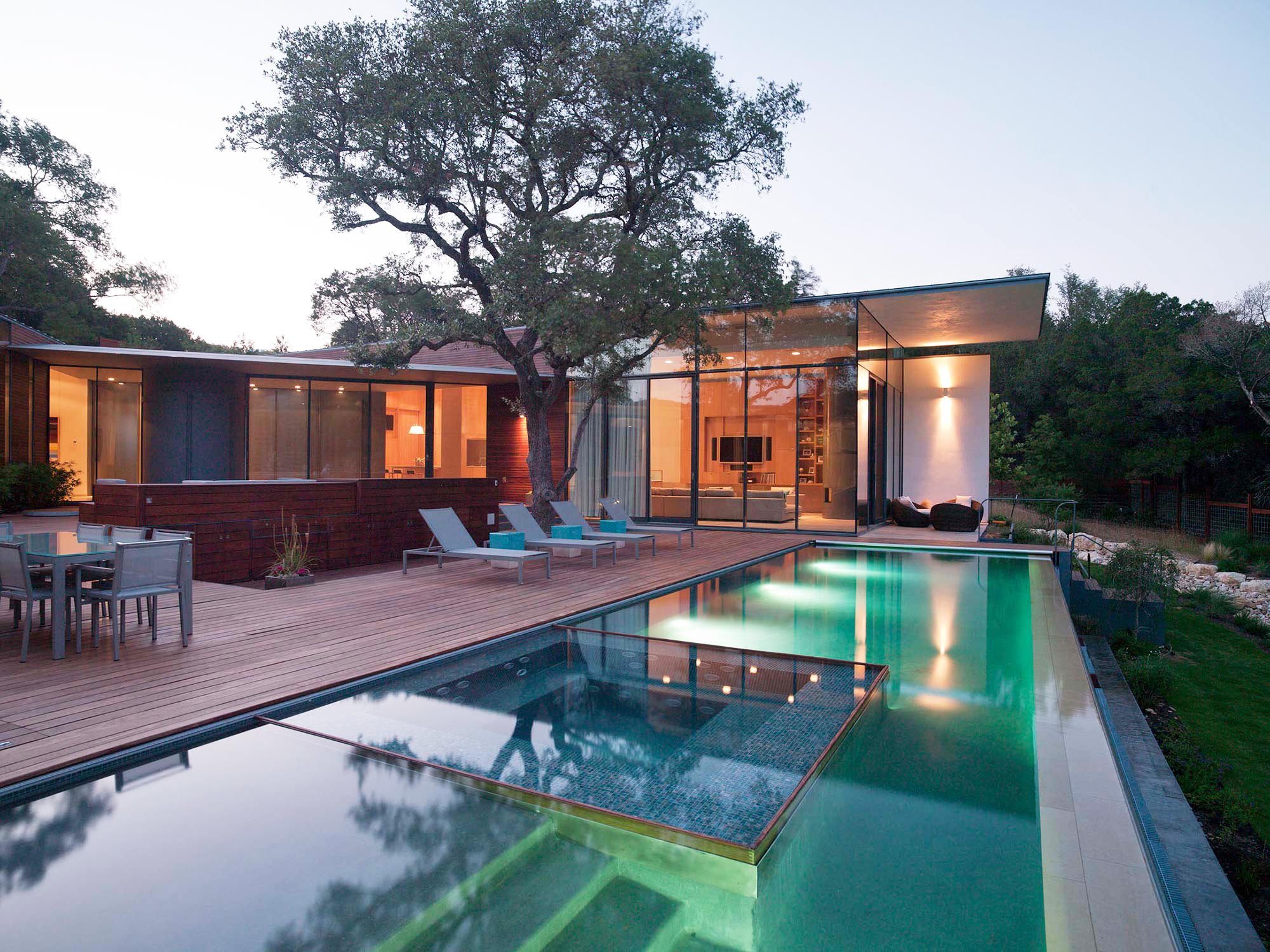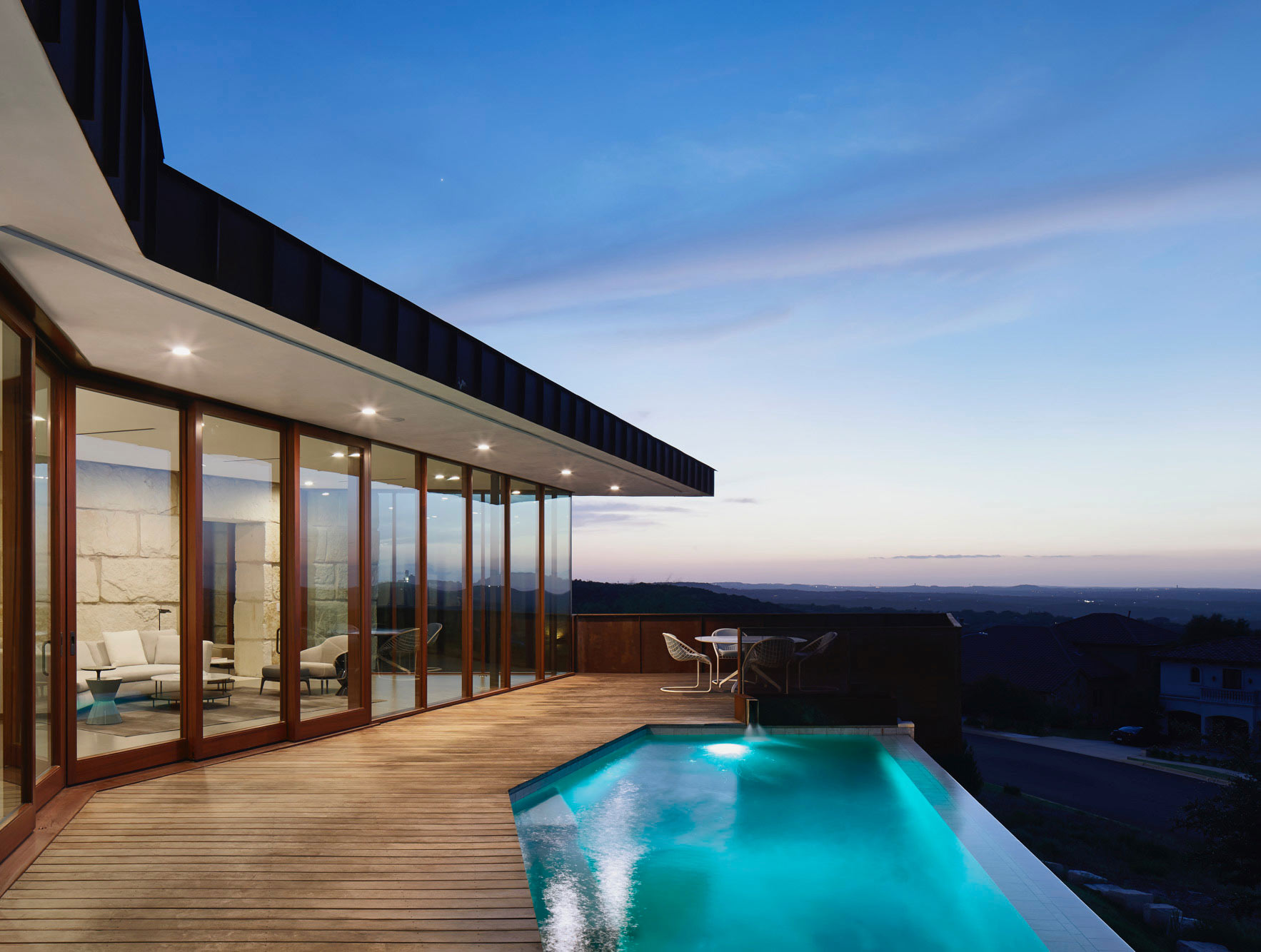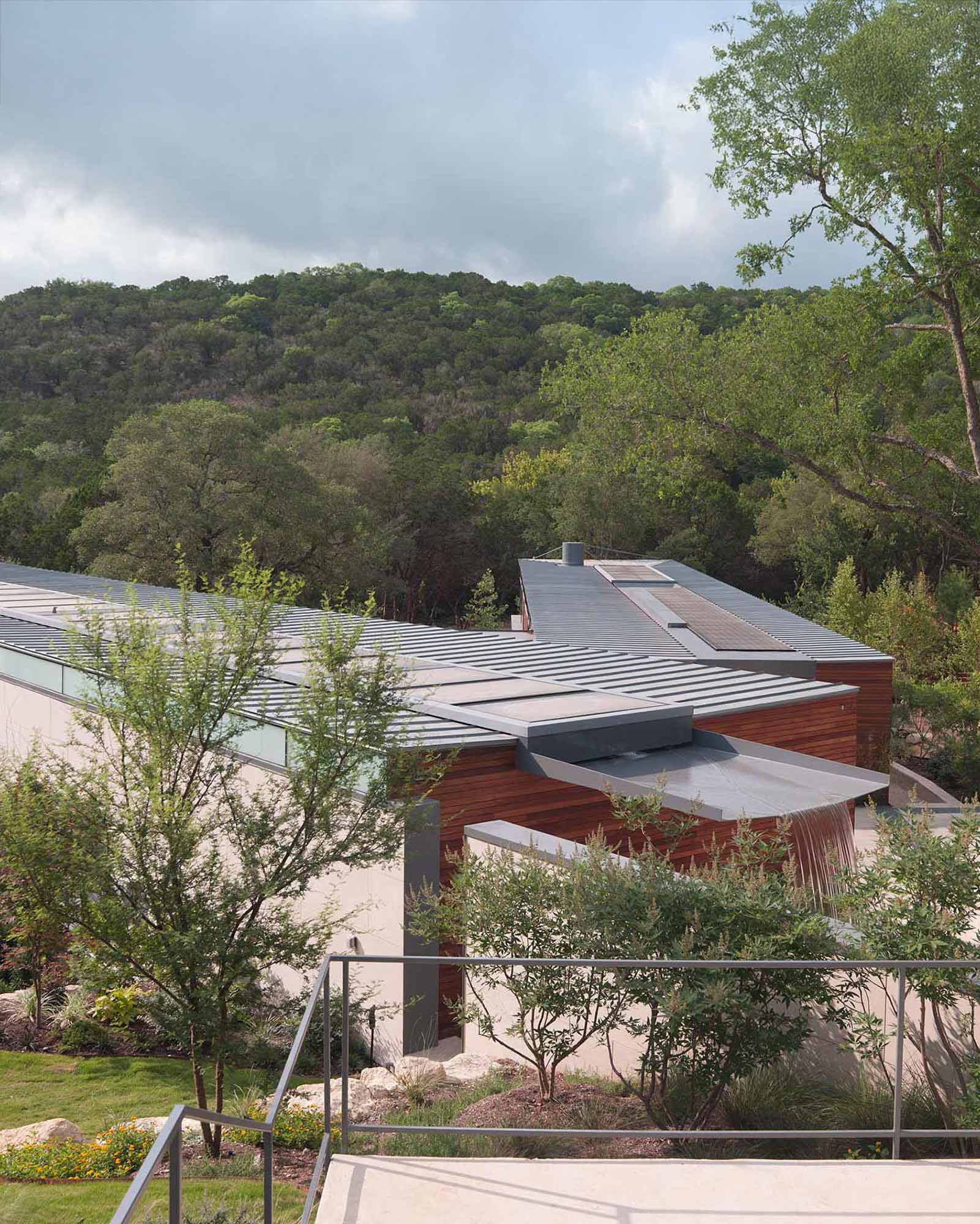 Carved into a limestone hillside, the home integrates water, energy, and form to live in quiet reciprocity with the Texas landscape