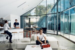 The project’s design is as much about healing the land as it is about inhabiting it. By reintroducing over forty native plant species in collaboration with the Lady Bird Johnson Wildflower Center, the landscape restores the site’s ecological balance and softens the industrial edge of its surroundings. The home’s two slender pavilions—one for living, one for sleeping—are separated by an open-air courtyard, requiring residents to engage directly with the outdoors as they move through the space.