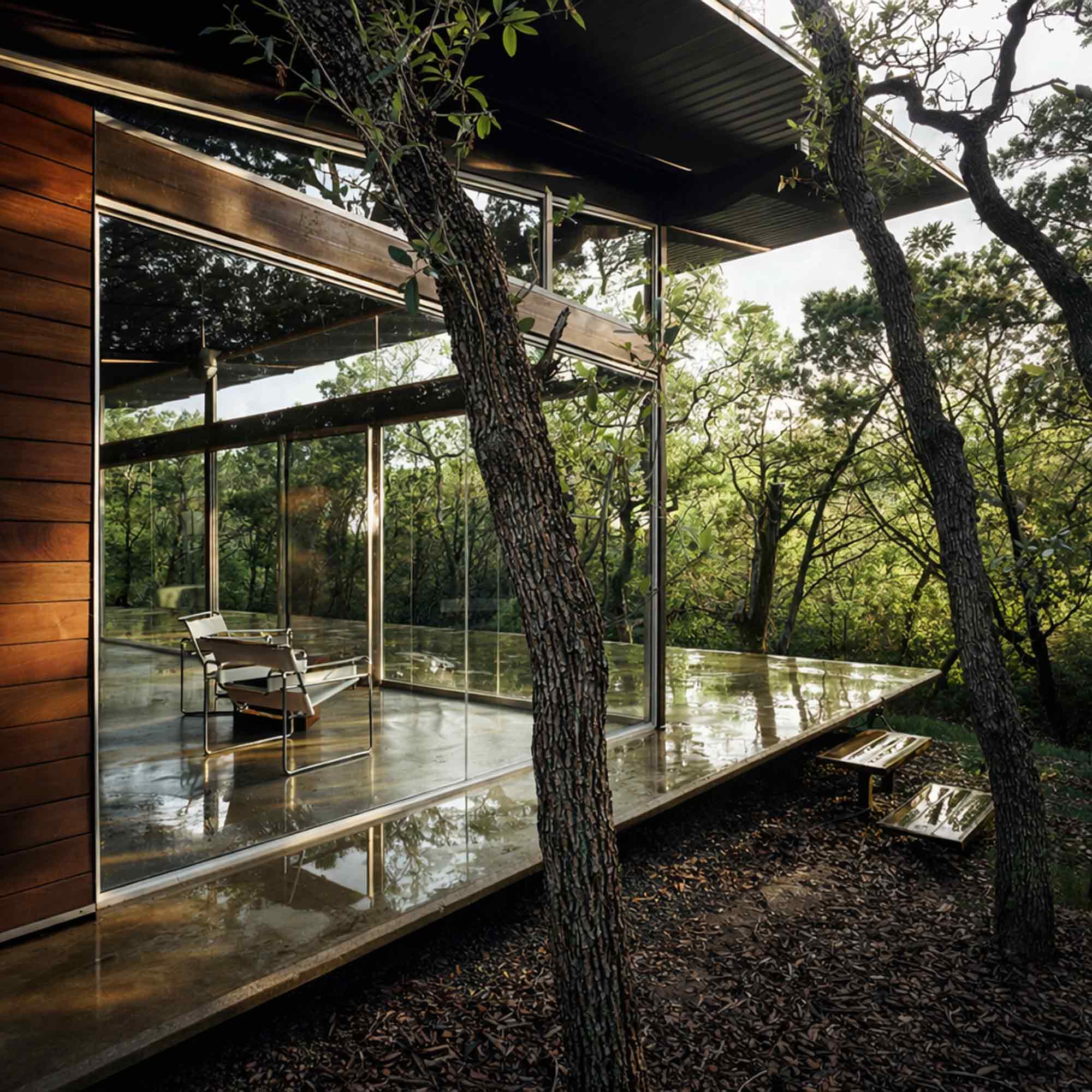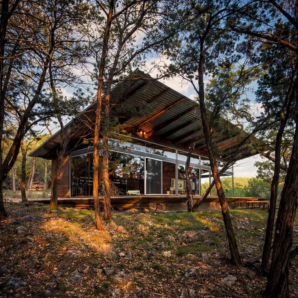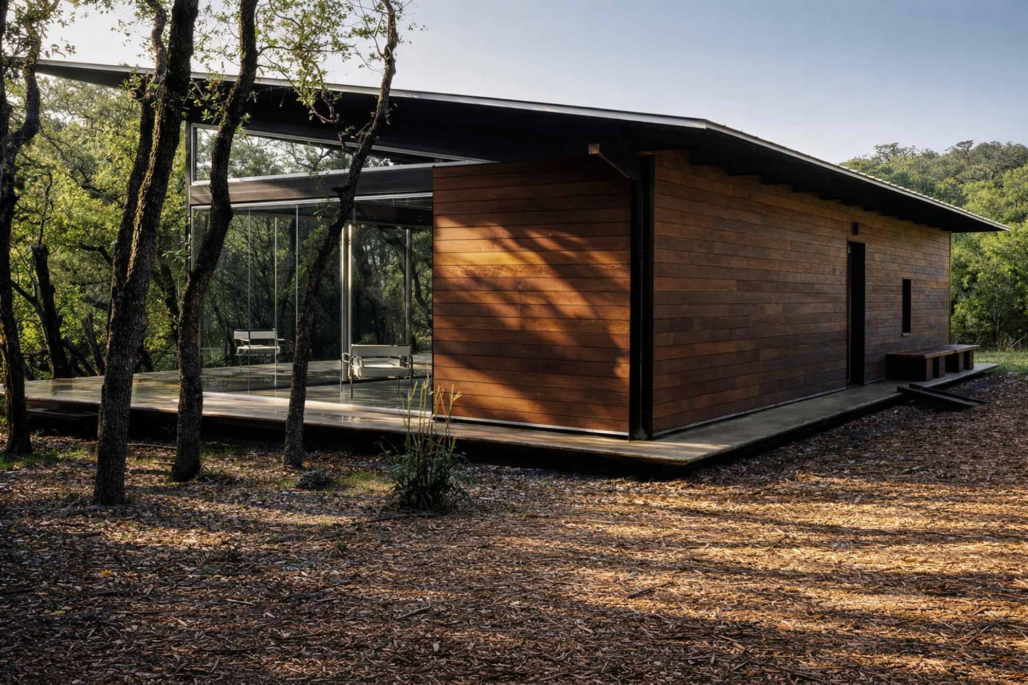 • Lago Vista Residence was commissioned by a highly creative family, including a painter, writer, and set designer, as a vacation home and artists’ retreat. The house is conceived as a simple shed form defined by a large cantilevered roof that shelters an expansive exterior patio, while the cantilevered foundation extends this sense of levitation and lightness into the landscape. On the entry side, a wood-clad volume contains the more functional elements of the program; beyond this utilitarian core, the house opens outward on all sides toward the patio and the creek beyond, creating a retreat shaped by clarity, openness, and quiet connection to its setting.