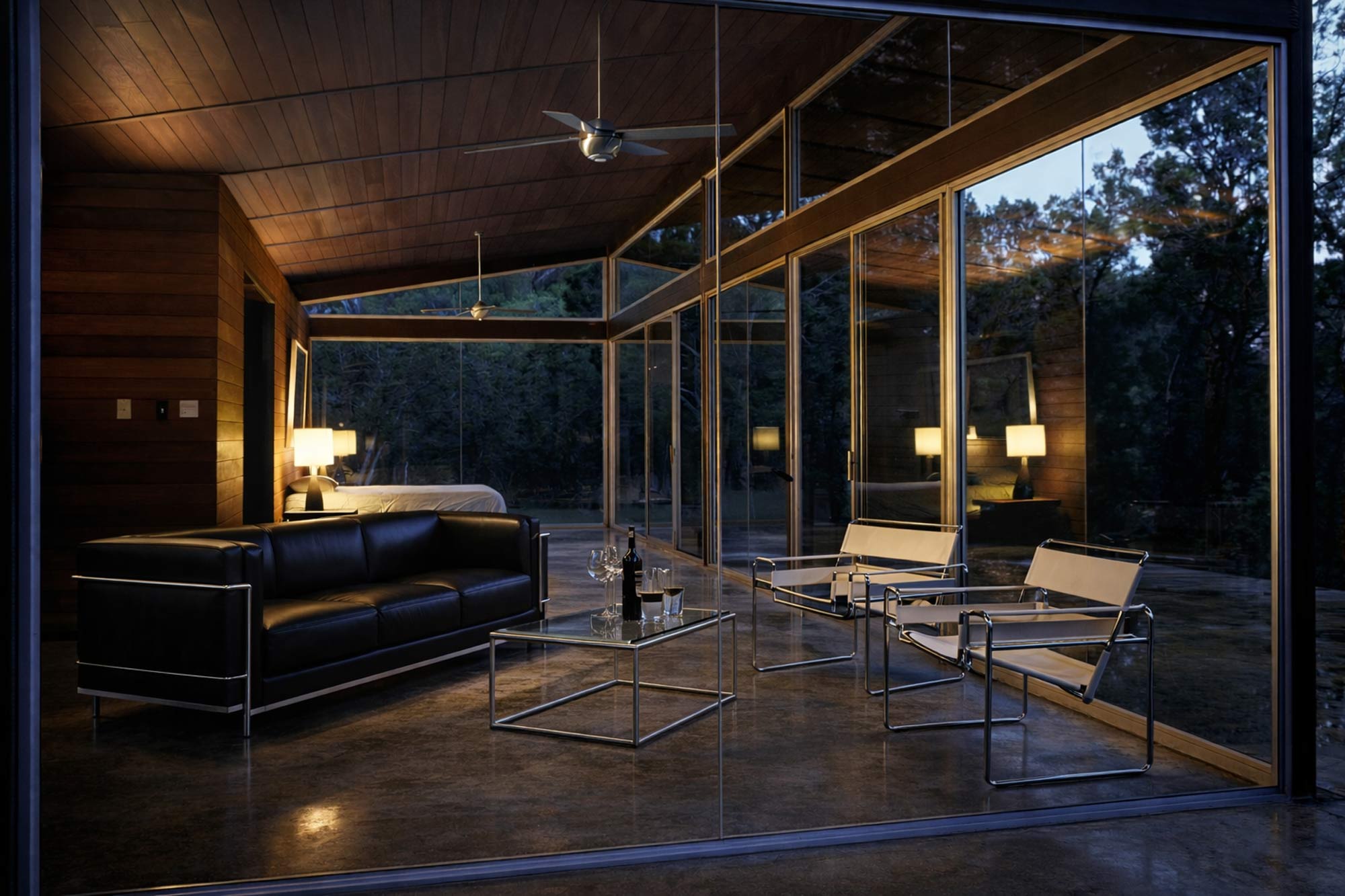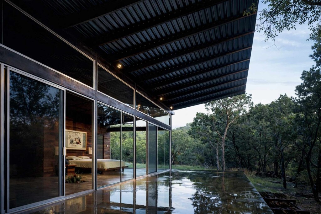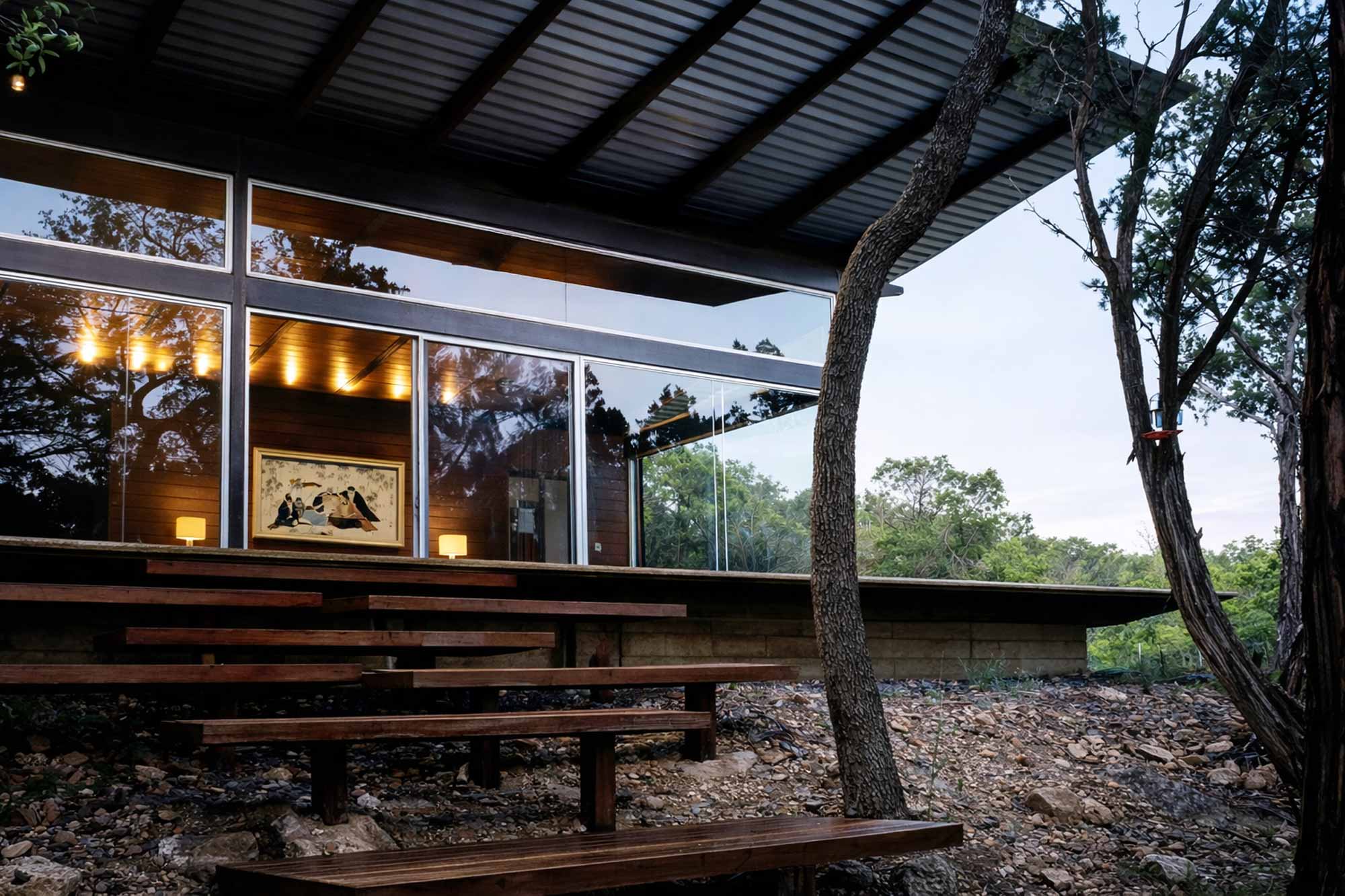 • Lago Vista Residence was commissioned by a highly creative family, including a painter, writer, and set designer, as a vacation home and artists’ retreat. The house is conceived as a simple shed form defined by a large cantilevered roof that shelters an expansive exterior patio, while the cantilevered foundation extends this sense of levitation and lightness into the landscape. On the entry side, a wood-clad volume contains the more functional elements of the program; beyond this utilitarian core, the house opens outward on all sides toward the patio and the creek beyond, creating a retreat shaped by clarity, openness, and quiet connection to its setting.
