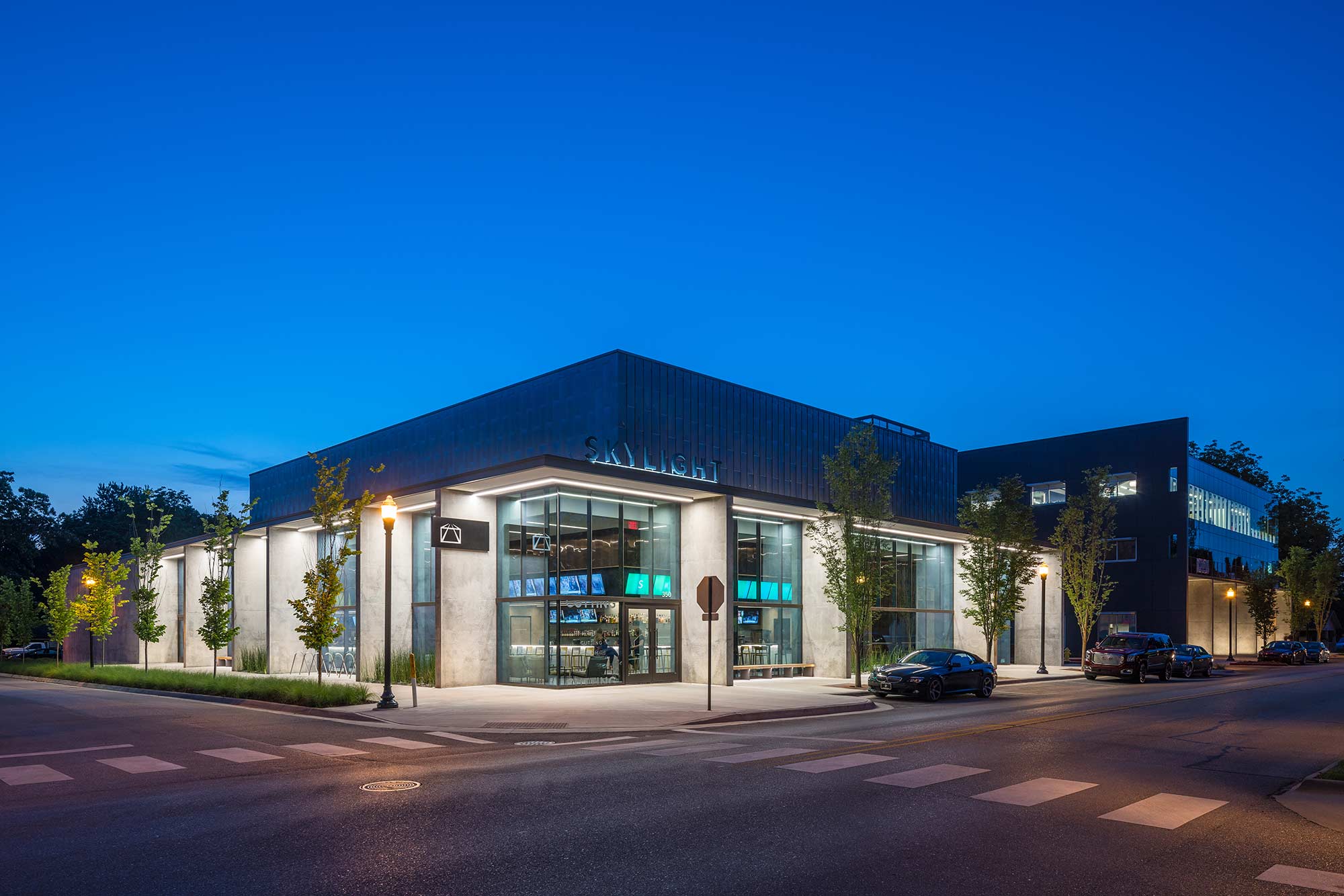 Skylight Cinema redefines the movie-going experience through a synthesis of architecture, technology, and social space. The 15,000-square-foot complex integrates a state-of-the-art digital theater, a full-service kitchen, and flexible gathering areas that can transform into a sports bar and event venue. The design prioritizes the pedestrian experience, creating an active dialogue between the building and its surroundings.