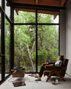 At the center, an outdoor courtyard forms the shared heart of the home, gathered around an existing limestone boulder. Here, the surrounding elements—stone, wind, water, and fire—come together in a single sheltered space, grounding the family within the landscape.