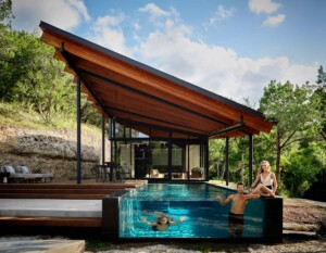 Falling Leaves House occupies a ten-acre hillside in West Austin, where the design interprets the curved motion of oak leaves as a series of sculpted pavilion roofs. Three glass pavilions step down the limestone bluff, positioned to frame the surrounding forest, creek, and wildlife corridor. A carved cut in the slope forms the building pad and exposes the natural stone, echoing the grottos found along the creek below.
